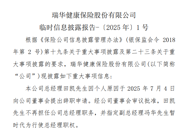 7月15日,瑞华健康保险股份有限公司(下称“瑞华健康”)发布公告称,总经理田凯因个人原因向公司董事会提出辞职申请。经公司董事会审议批准,田凯不再担任公司总经理职务,并指定副总经理冯华暂时代为行使总经理职权。